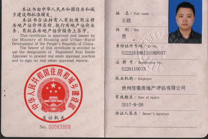 2011年7月房地产估价师资质注册在贵州信德房地产评估有限公司,成为注册房地产估价师。